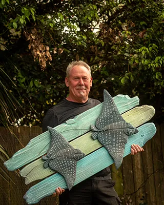 Mr. Walsh is a Gulf Coast native and self-taught professional artist known for his coastal-themed wood-carved sculptures crafted from locally reclaimed materials and found objects. His mixed-media work combines carved wood with unexpected textures and whimsical flair, and can be found in homes, businesses, and rental properties throughout the Gulf Coast region.